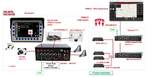 | Communications solution for Railways sector (future replacement of GSM-R) supporting both vital (i.e. signallling) and not vital applications levaraging broadband connectivity (aiming at 5G) and MCX protocol. Leonardo provides an innovative complete solution including: - Ground center: redundant FRMCS server (layered upond MCX server) , redundant MPTCP server (implementing multiple path connection management) and operators workstation (layered on MCX dispatchers) - on board segment: FRMCS Can Radio (leveraging eNOBU Platform) and driver terminal; IPCONN gateway with multiple radio channel management - operational telephony: rigged android smartphone with based on MCX app Leonardo FRMCS can work as an OTT application decoupling railkways applications from underlying connectivity It can take advantage of multiple radio paths including Satcom employing MPTCP protocol. |