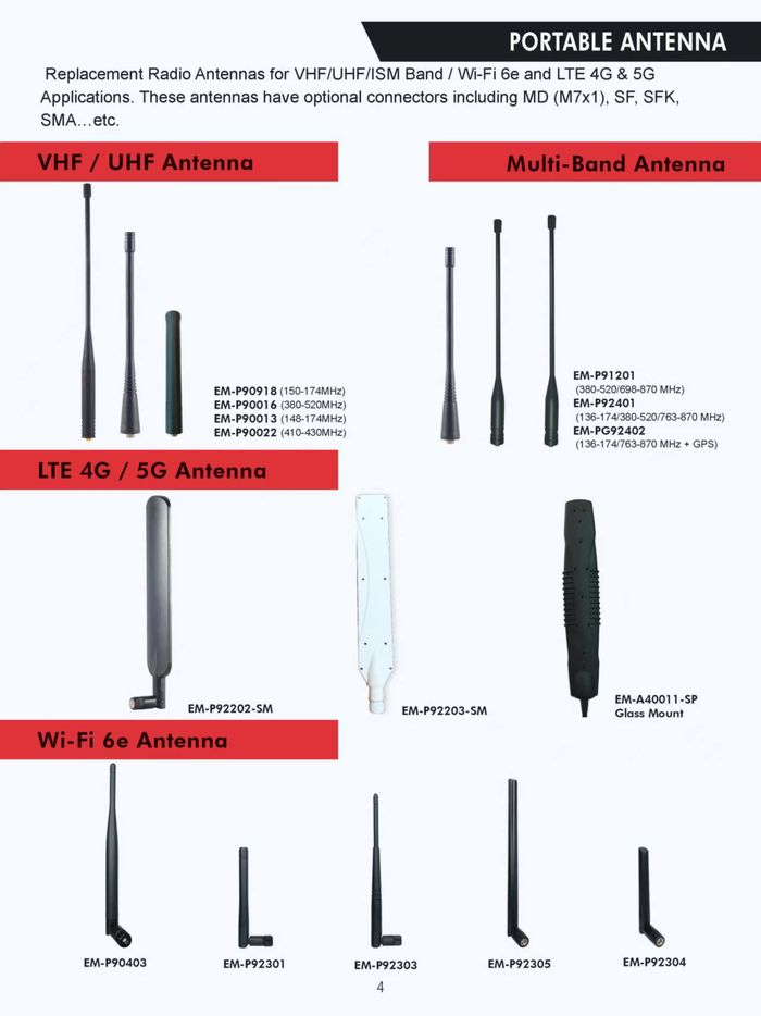 Replacement Radio Antennas for VHF/UHF/ISM Band / Wi-Fi 6e and LTE 4G & 5G Applications. These antennas have optional connectors including MD (M7x1), SF, SFK, SMA...etc.
