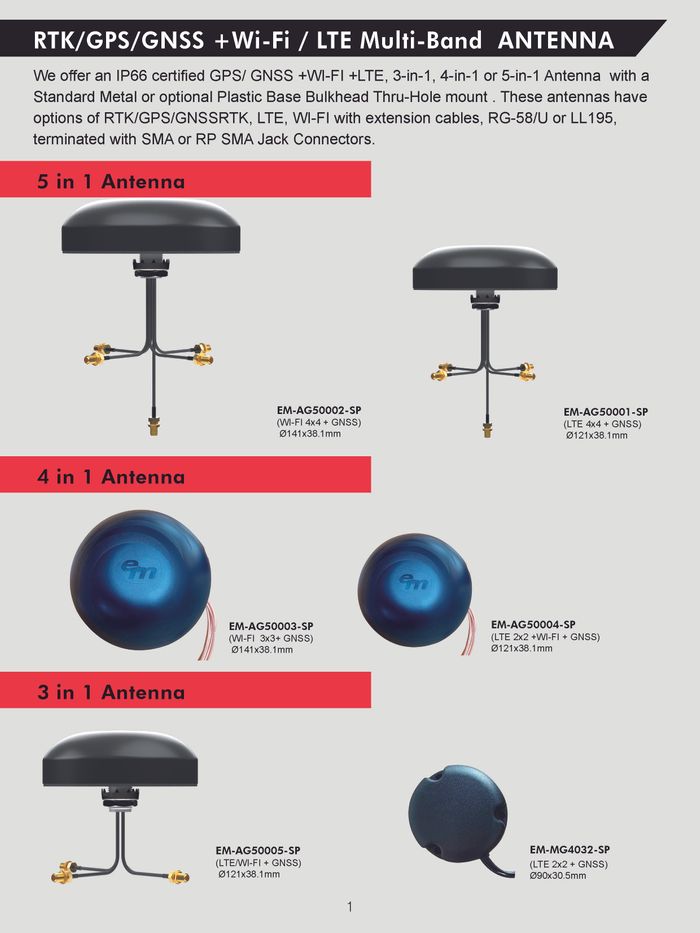 JOYMAX Europe GmbH offers an IP66 certified GPS / GNSS +WI-FI +LTE, 3-in-1, 4-in-1 or 5-in-1 Antenna with a Standard Metal or optional Plastic Base Bulkhead Thru-Hole mount. These antennas have options of RTK/GPS/GNSS, LTE, WI-FI with extension cables, RG-58/U or LL195, terminated with SMA or RP SMA Jack Connectors.